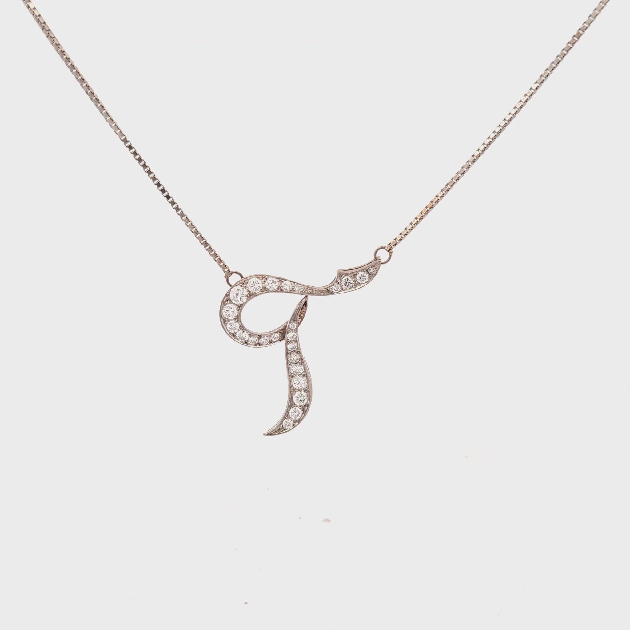 Prachtige geraffineerde 14k witgouden collier met witgouden T-hanger volgezet met diamanten. De hanger heeft een sierlijke letter T-vorm en bevat 0,94ct aan briljant geslepen diamanten.