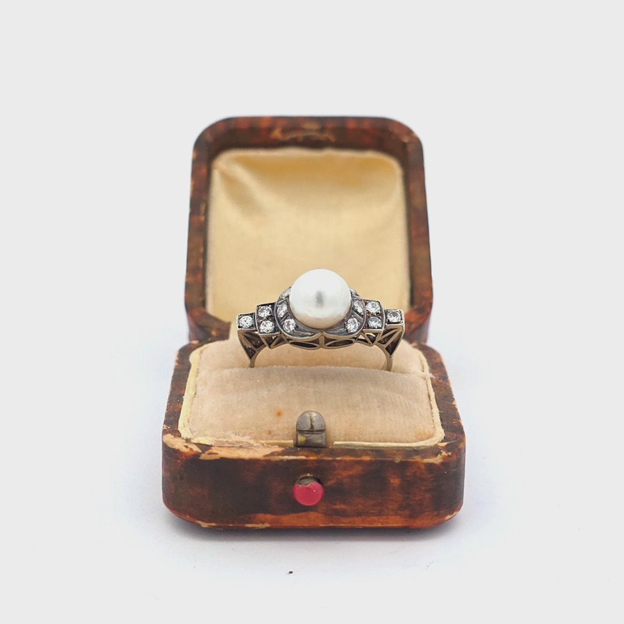 Een prachtige antieke 14k witgouden ring met een mooie natuurlijke parel in het midden. De parel wordt omringd door schitterende diamanten gezet in een mooie sierlijke zetting. De ring kan als statement ring gedragen worden om de wijsvinger of sierlijk om de ringvinger.
