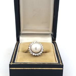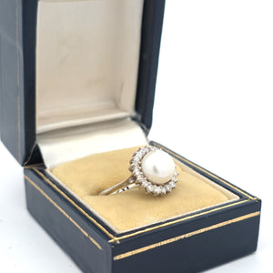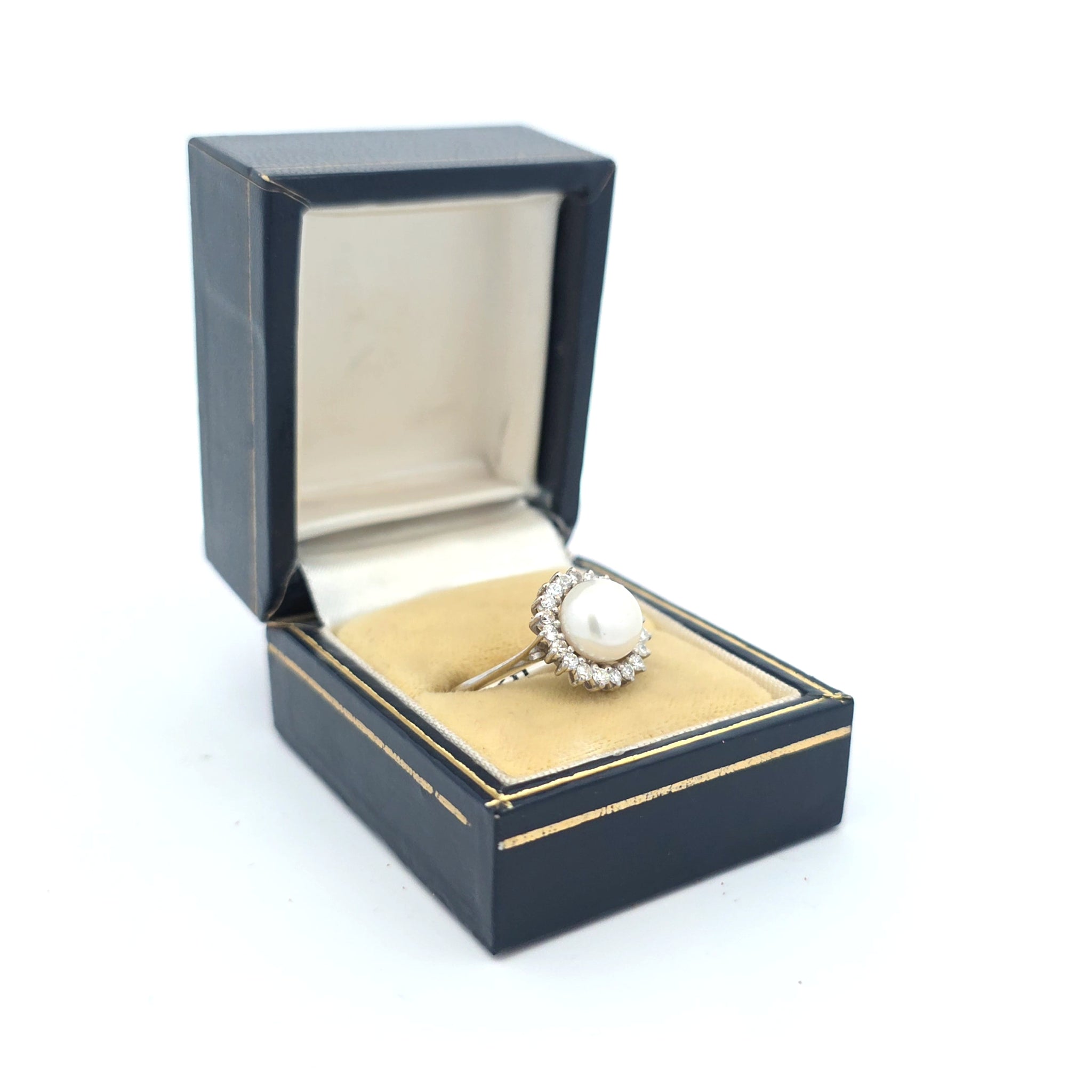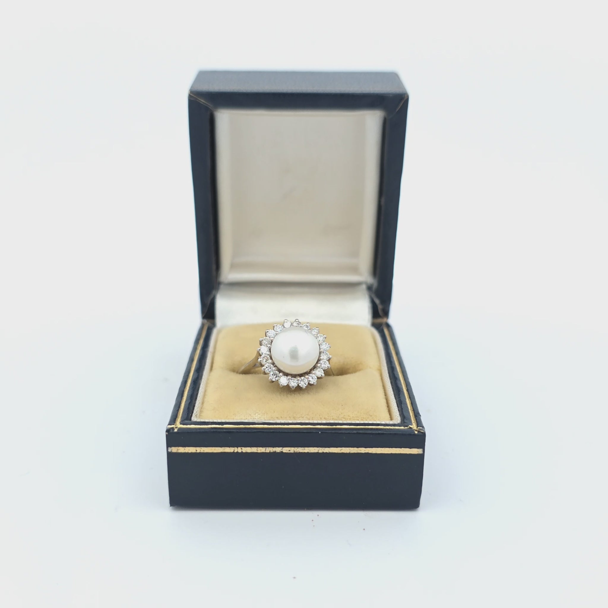 Ontdek de tijdloze schoonheid van deze elegante 18k witgouden ring met een parel en diamanten. Deze prachtige centrale parel is omgeven door een halo van sprankelende diamanten, waardoor het het perfecte accessoire is voor elke speciale gelegenheid. Dit prachtige sieraad getuigt van vakmanschap en stijl.