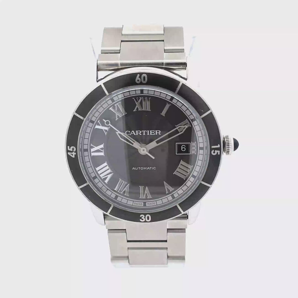 De volledig stalen kast en bijpassende stalen band geven het horloge een robuuste en elegante uitstraling, terwijl de zwarte bezel en zwarte wijzerplaat zorgen voor een opvallend, sportief contrast. De kenmerkende sword hands voegen een scherp, stijlvol detail toe dat de leesbaarheid en iconische Cartier-stijl benadrukt.